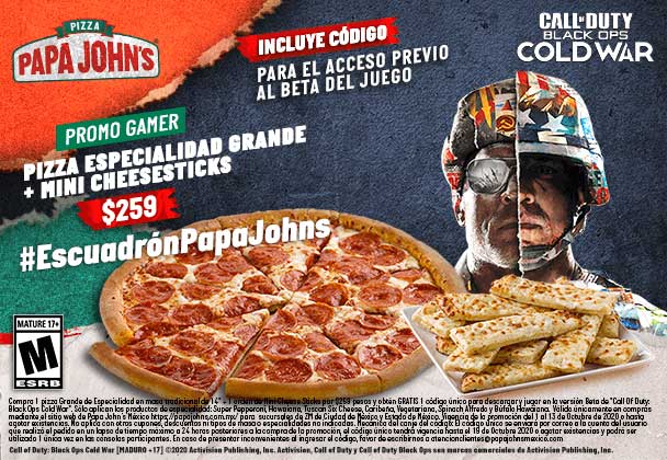 La promoción de Papa John’s que incluye un código de acceso anticipado a la beta de Call of Duty: Call of Duty Black Ops Cold Ward está disponible en la compra de una Pizza Especialidad Grande + una orden de Mini Cheesesticks que tiene un precio de $259 MXN (pesos mexicanos).