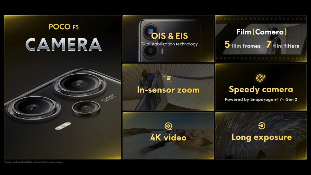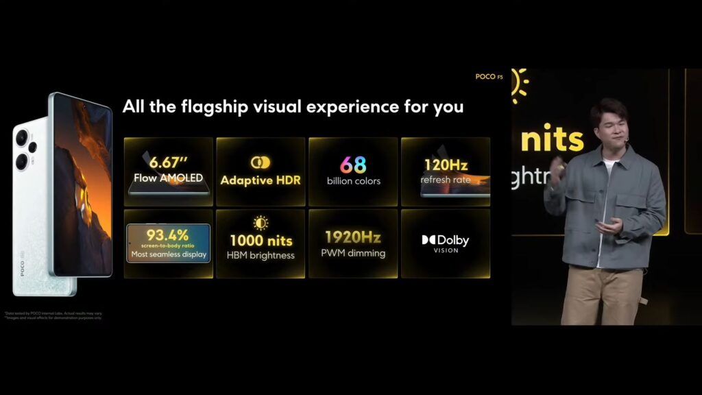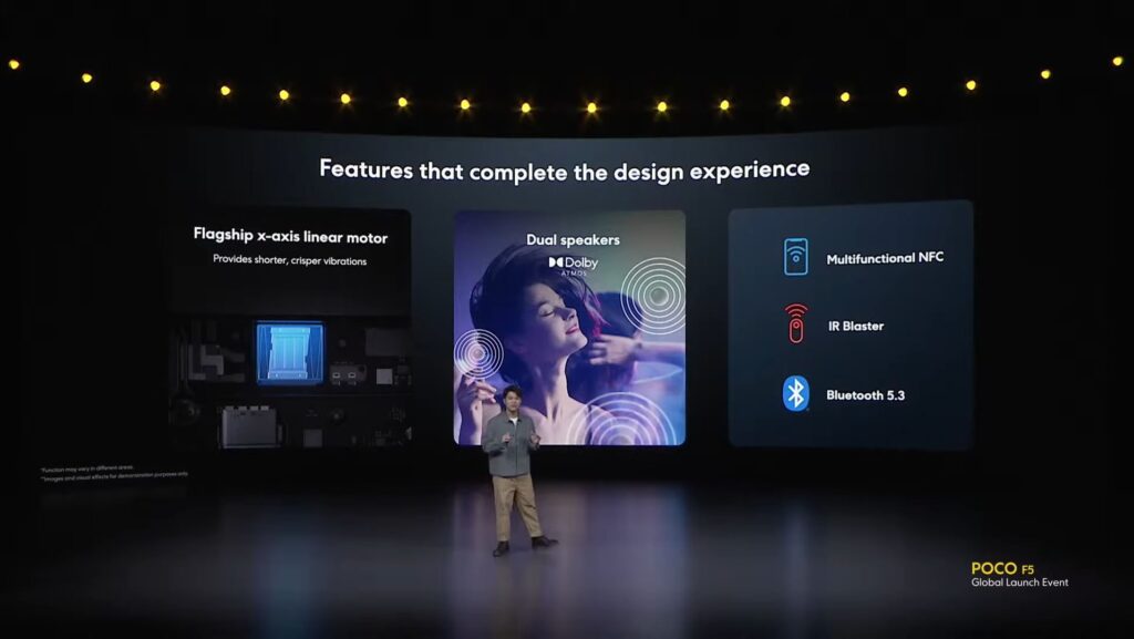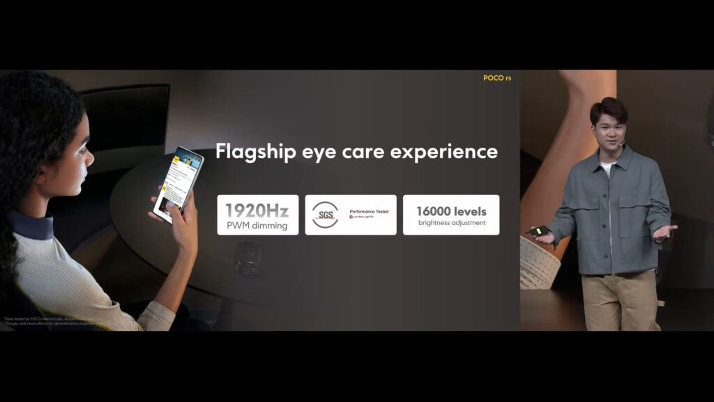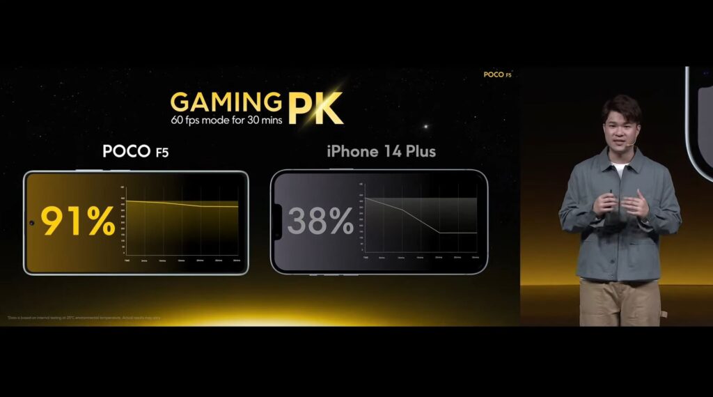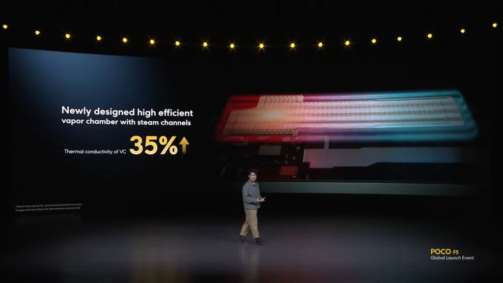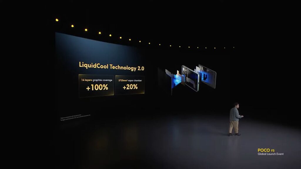 POCO también señaló que el sistema Liquid Technology 2.0 brinda hasta 35% mayor conductividad térmica y aseguran que el POCO F5 puede trabajar a 37.9°C y entregar 59.7 FPS con brillo de 400 nits. Adicionalmente se ha incluido la Tecnología FEAS 2.2 que mejora hasta en 8.7% el rendimiento en juegos MOBA y hasta 5.8% en juegos RPG.