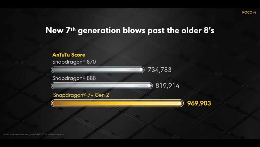 El POCO F5 tiene varios puntos importantes a tomar en cuenta, como por ejemplo: es uno de los primeros smartphone que se lanza al mercado con el procesador Qualcomm Snapdragon 7+ Gen 2 que promete hasta 20% mayor rendimiento que el Snapdragon 888 lanzado en 2021.