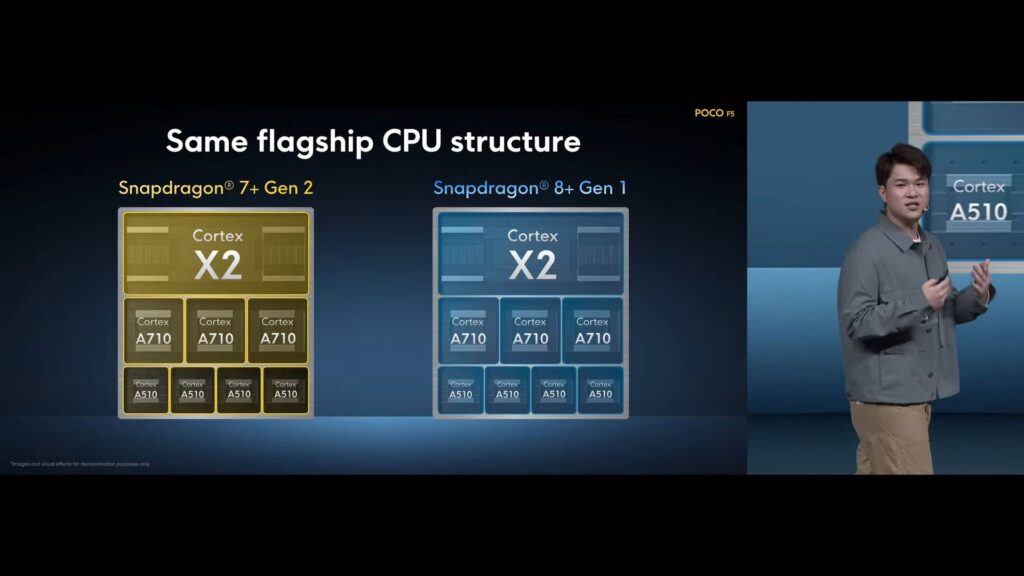 En términos generales, el Snapdragon 7+ Gen 2 comparte especificaciones similares del Snapdragon 8+ Gen 1 ya que cuenta con la misma cantidad de 8 núcleos distribuidos en tres clústers: 1 x núcleo Corte-X2 de 2.91 GHz, 3 x núcleos Cortex-A710 de 2.49 GHz, y 4 x núcleos Cortex-A510 de 1.8 GHz.