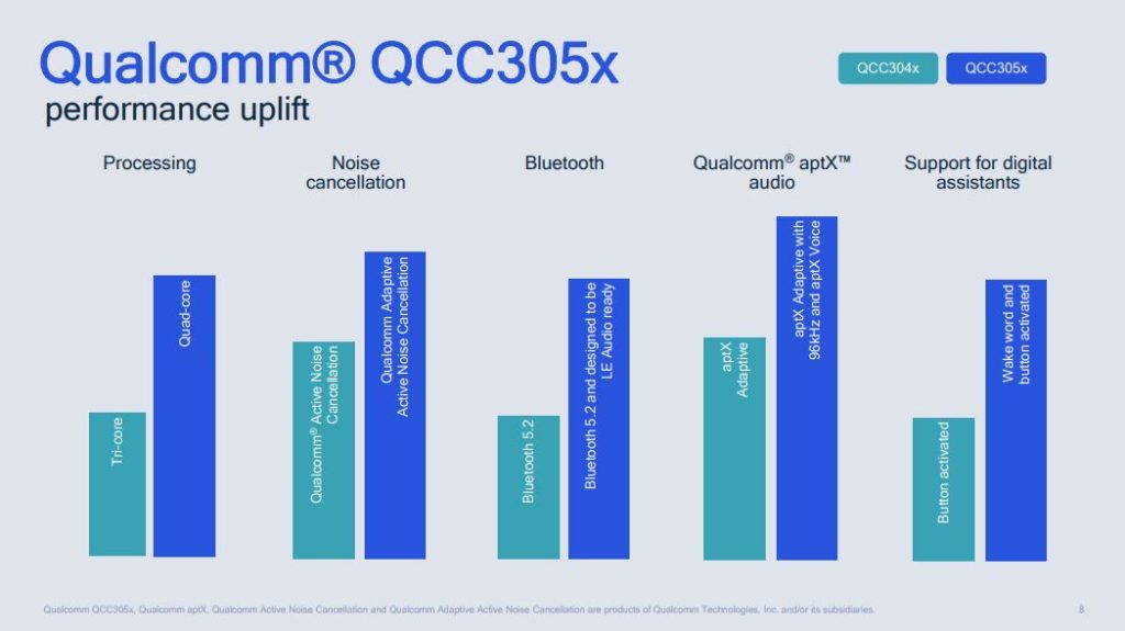 Una de las grandes ventajas del SoC Qualcomm QC305x es que ofrece optimizaciones de más robustas de conectividad y bajo consumo de energía al igual que mejor integraciones comparado a generaciones previas para una mejor experiencia de audio en audífonos inalámbricos.