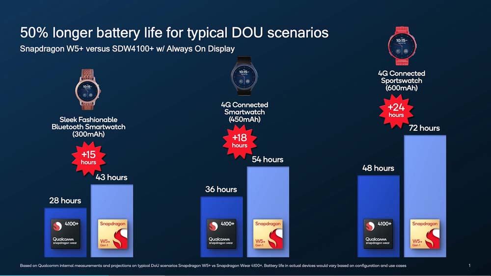 Las plataformas para wearables Snapdragon W5+ Gen 1 y Snapdragon W5 Gen 1 están fabricados mediante el proceso de 4nm y son el reemplazo directo de la plataforma Snapdragon Wear 4100+. Este nuevo diseño promete hasta 50% menor consumo de energía, 2x veces mayor rendimiento, 2x veces mayores funcionalidades y que serán 30% más pequeñas comparado con generaciones previas.