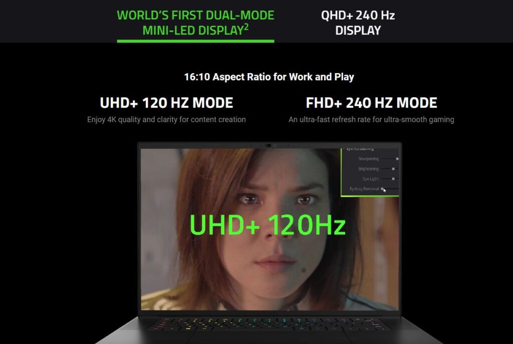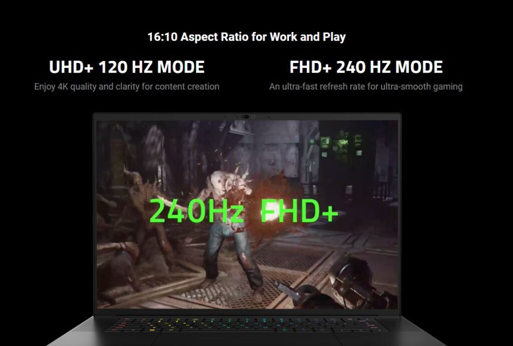 Lo interesante es que algunas versiones cuentan con un modo llamado mini LED dual-mode. Esto se refiere a que incluyen paneles que tienen la capacidad de cambiar entre un modo con resolución FHD+ (1920 x 1080 píxeles) con 240 Hz para gamers y resolución UHD+ (3840 x 2400 píxeles) y 120Hz para creadores de contenido.