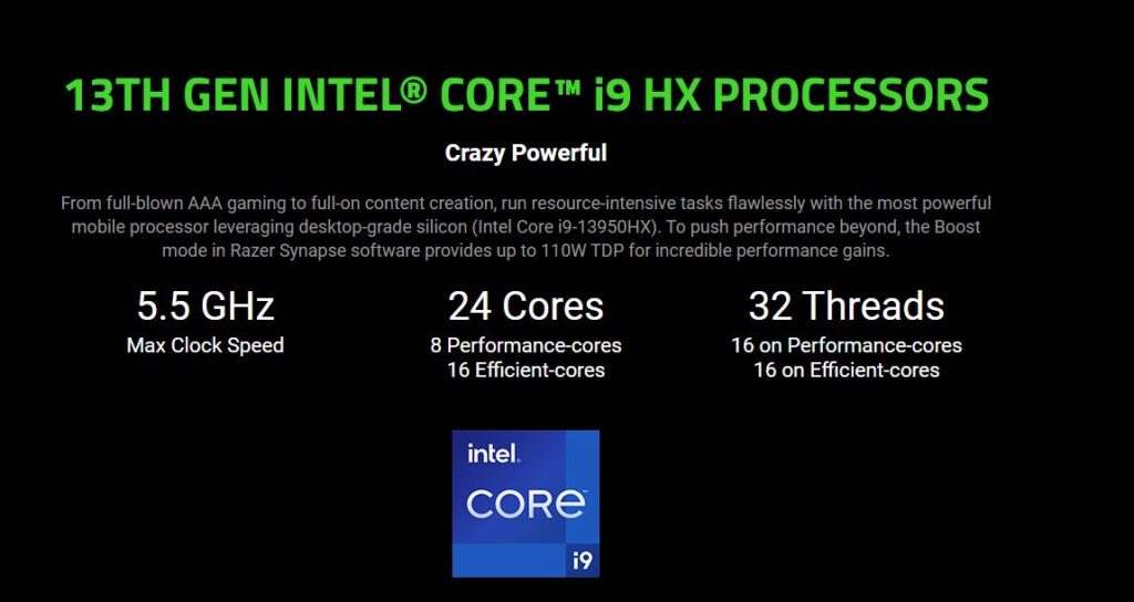 La laptop gamer Razer Blade 16 (2023) cuenta con un procesador Intel Core i9-13950HX de 13a Generación y 5.6 GHz. Se puede configurar con 16GB y hasta 64GB de memoria DDR5-5600 MHz, y para almacenamiento con hasta una SSD PCIe Gen 4 de 2TB.