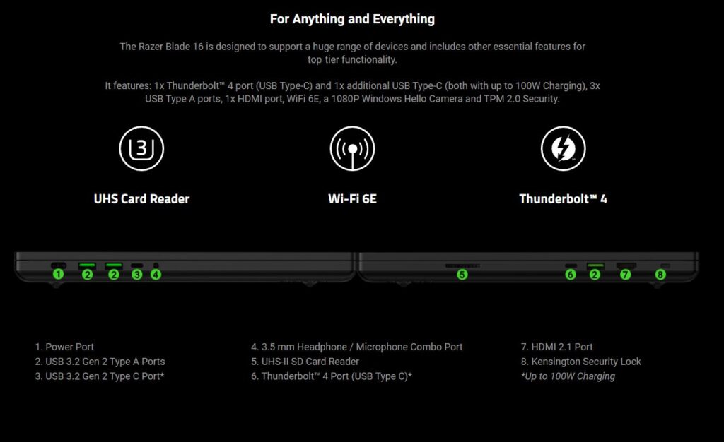 Todos los modelos incluyen una webcam FHD IR con obturador de privacidad, un teclado Razer Chrome con anti-ghosting, un arreglo de cuatro bocinas con THX Spatial Audio, y una batería de 6,182 mAh. Cabe mencionar que las versiones con RTX 4080 y RTX 4090 vienen con un adaptador de energía GaN de 330W y el resto con uno GaN de 280W.