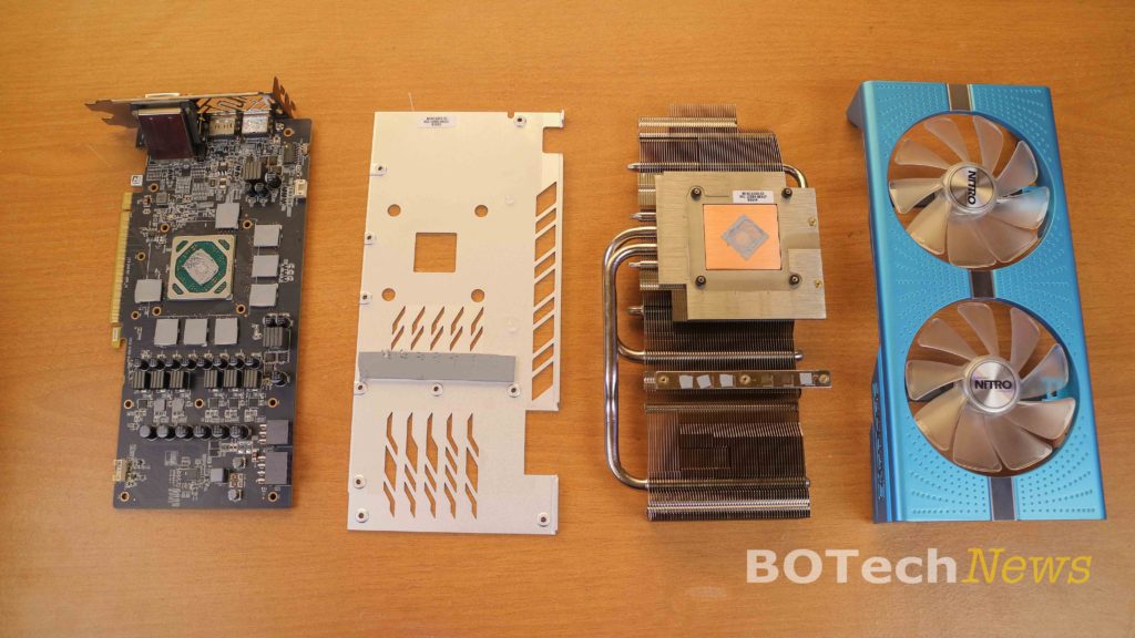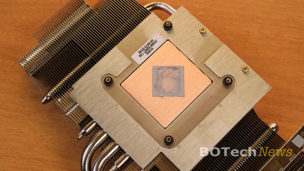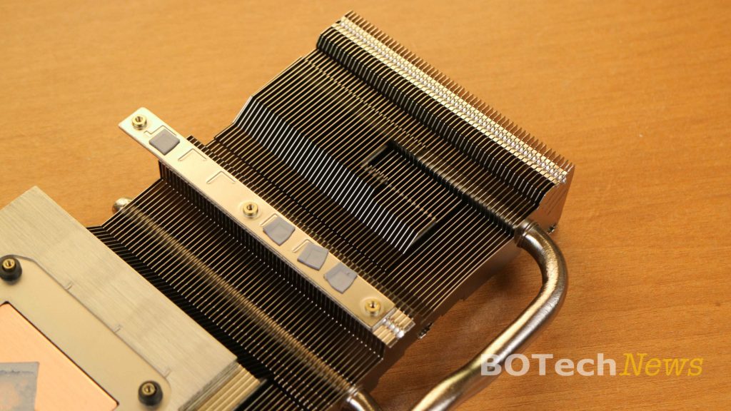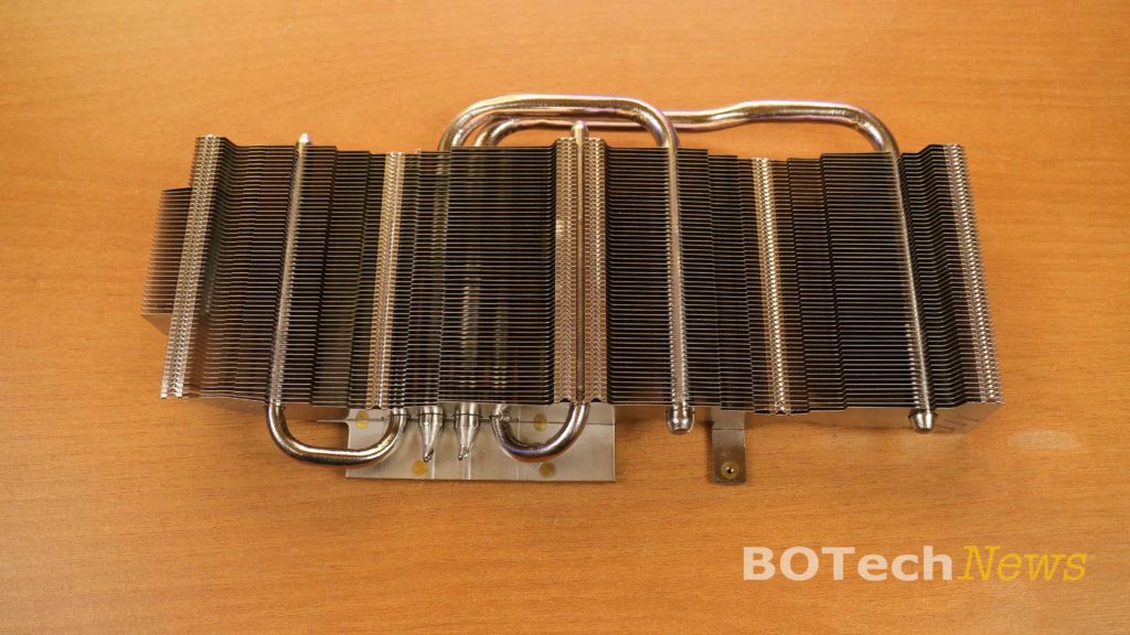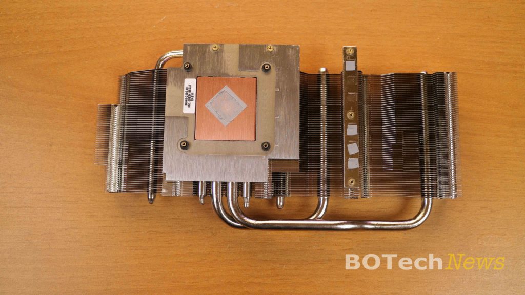 A continuación sólo resta retirar el disipador del PCB de la tarjeta. Esto nos permite apreciar que está conformado de un denso arreglo de 54 aletas de aluminio con dos heatpipes de 8mm y dos heatpipes de 6mm.