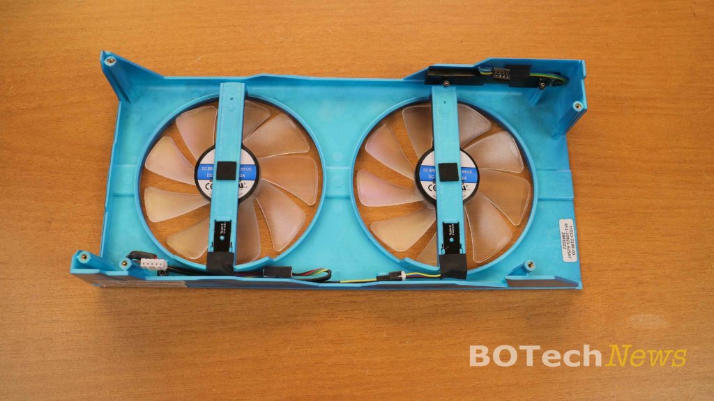 El siguiente paso es remover la carcasa de plástico que sostiene los ventiladores. Aquí debemos tener cuidado ya que la carcasa está conectada al PCB mediante dos conectores: uno que alimenta los ventiladores y otro que ilumina el logo Sapphire de color azul.