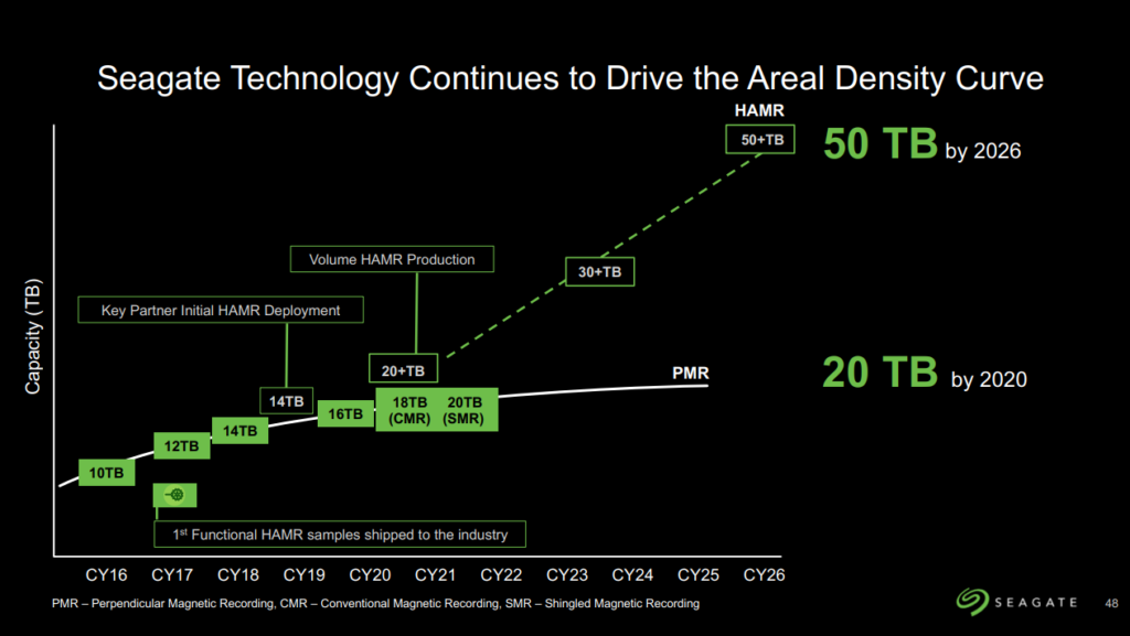 Como parte de su estrategia para satisfacer la demanda de discos duros de alta capacidad, Seagate anuncó durante el Seagate Technology Analyst Day 2019 que lanzará discos duros de 18TB y hasta 20TB para el 2020 usando tecnologías actuales como CMR (Coventional Magnetic Recording) y SMR (Singled Magnetic Recording), respectivamente.