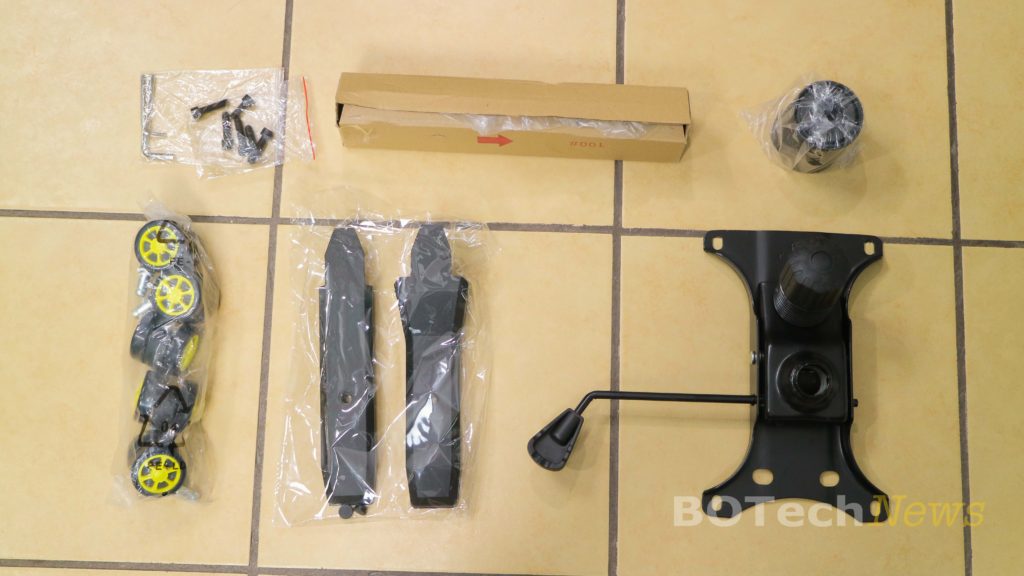 Dentro de la caja principal se localizan todos componentes y accesorios que necesitaremos par ensamblar la silla. Entre ello se encuentra el respaldo, el asiento, el mecanismo de inclinación, un par de guantes de tela que nos parecieron un excelente valor agregado y que no vemos todos los días, un par de llaves allen, tornillos, tapas de plástico, el pistón, las ruedas, etc.