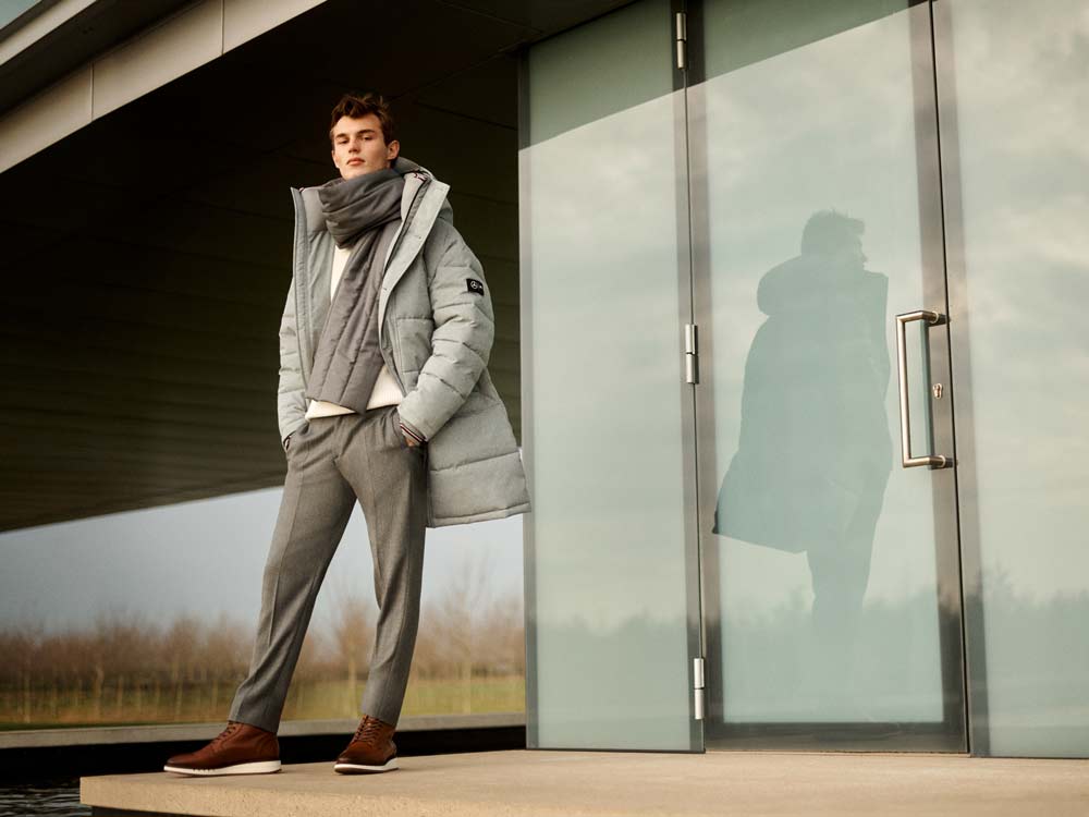 Lo anterior se traduce en estilos intemporales como una chaqueta utilaria, el bombardero, y la chaqueta de cuero que se elevan con un sofisticado giro a medida y elementos técnicos como acabados de control climático, perforaciones, cintas engomadas, sellos de costura y cieres ajustables con Velcro.