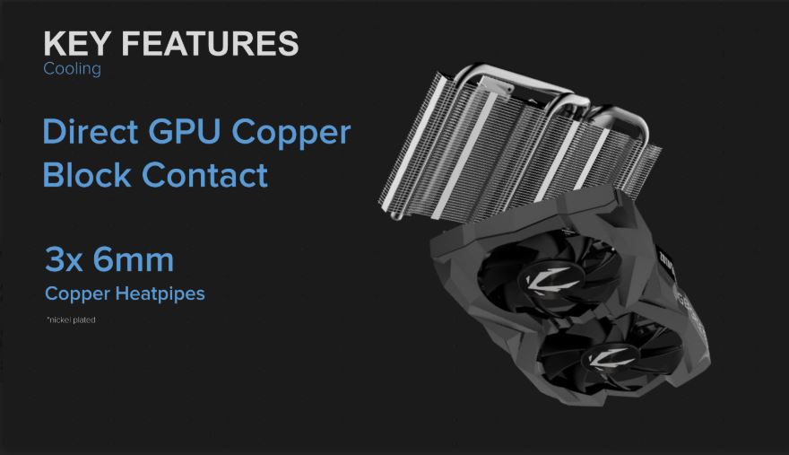 Debajo de la carcasa se tiene un bloque denso de aletas de aluminio donde atraviesan tres heatpipes (pipas de calor) de 6mm de cobre niquelados, mismos que hacen contacto directo con un bloque colocado exactamente encima del GPU.