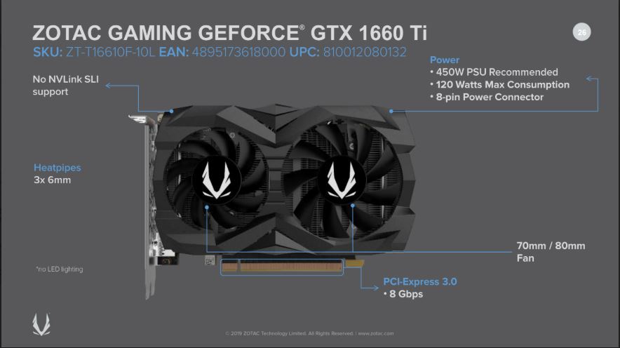 En cuestiones más generales. La ZOTAC GAMING GeForce GTX 1660 Ti no tiene soporte NVLink SLI como el resto de modelos. Tiene un TDP de 120W para lo que necesita un conector de alimentación de 8-pines y se recomienda utilizar una fuente de poder de 450W.